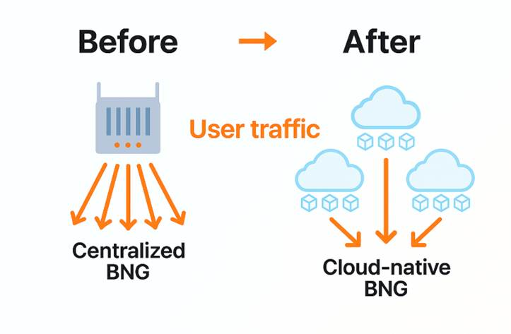 BNG has now evolved into cloud-native deployments, running as VNFs or CNFs instead of fixed hardware.